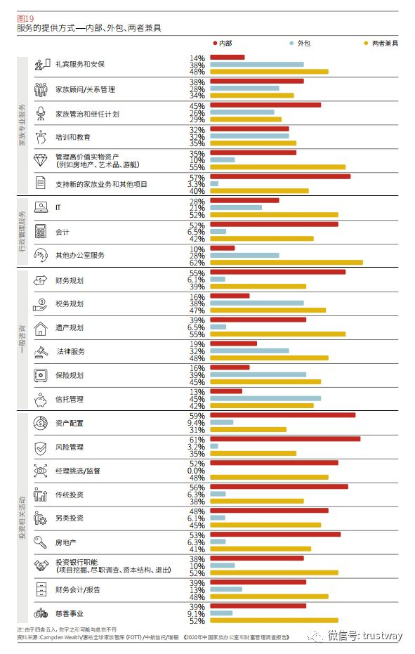 此外,相当大比例的家族表示,由内部或者内外部共同提供会计服务(分别为52%和42%),财务规划(55%和39%)和遗产管理(39%55%)也是如此。