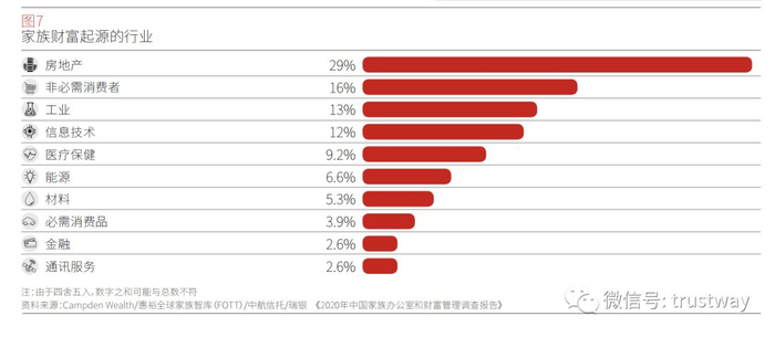 29%的参与者表示,家族财富起源于房地产行业。紧随房地产之后的是非必需消费品(16%)和工业品(13%)。非必需消费品包括零售(5.3%)、服装和纺织品(5.3%),而工业包括设备制造(9.2%)。
