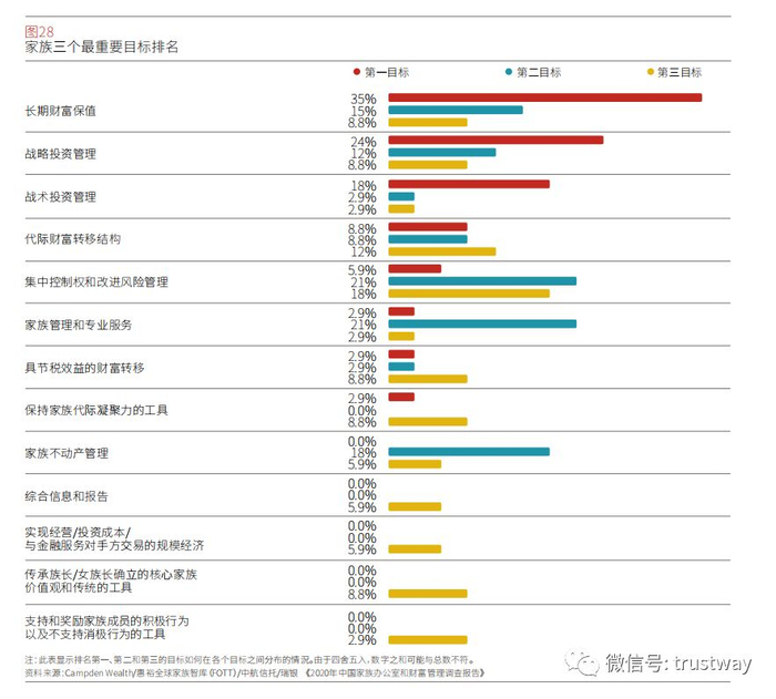 值得一提的是,在要求各家族列出三个最重要的目标时,长期财富保值排名第一(35%),其次是战略和战术投资管理(分别为24%和18%)。