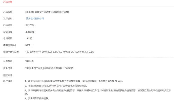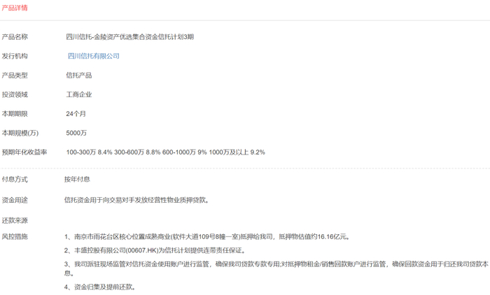 但令人疑惑的是,小编查询到在2019年12月到2020年3月,四川信托曾经连续发行了三期信托产品“金陵资产优选集合资金信托计划”,抵押物正是“南京市雨花台区核心位置成熟商业(软件大道109号8幢一室)”,评估价值为16.16亿,产品期限为24个月,每期募集规模为5000万元。