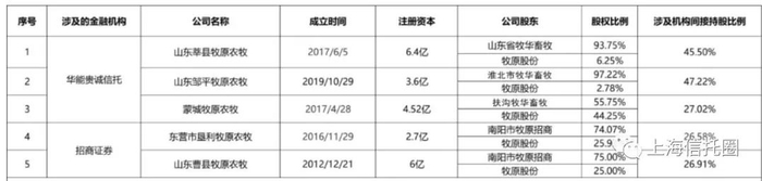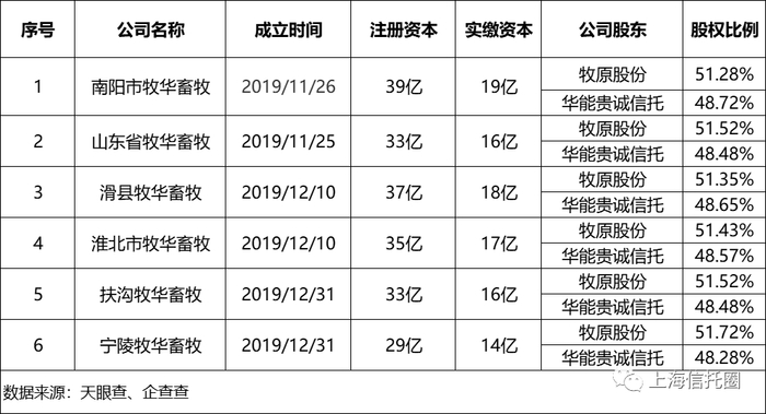 数据显示,南阳市牧华畜牧的注册资本为39亿元、山东省牧华畜牧的注册资本为33亿元、滑县牧华畜牧的注册资本为37亿元、淮北市牧华畜牧的注册资本35亿元、扶沟牧华畜牧的注册资本为33亿元、宁陵牧华畜牧的注册资本为29亿元,其实缴资本分别为19亿元、16亿元、18亿元、17亿元、16亿元、14亿元,正好对应了华能贵诚信托应缴纳的出资额。