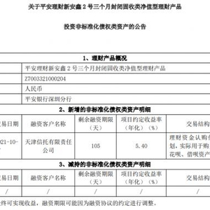 近期,平安理财一只“固收+期权”理财产品“新安鑫2号三个月封闭固收类”到期。南财理财通课题组从其公告披露信息发现,该产品曾投资过一项非标准化债权类资产,是由天津信托发行的“天实 61 号单一资金信托”。该项目交易结构为理财资金认购信托计划,实际用于购买蚂蚁花呗、借呗资产。