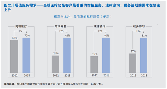家庭财富传承的需求同样带动了高净值客户对于税务和法律方面专业服务需求的提升(参阅图21)。再加上近期中国大陆加入CRS,新的个人所得税法案出台,房产税进入了热烈讨论和酝酿的阶段,高净值人士对于税务法律的专业意见需求更为突出。此项需求已经成为了私行客户的共性需求。调研发现,和2012年相比,高净值人士对于法律咨询、税务筹划的诉求显著提升。在私行可以提供的专业服务当中,认为法律咨询是最重要的服务之一的受访者比例从19%跃升至40%,排名从第六位提升至第三位;认为税务规划是最重要的服务之一的受访者比例从17%跃升至31%,排名从第八位提升至第四位。