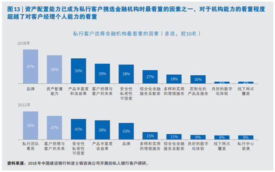 其次,高净值客户在挑选私行机构时,对其评价的维度发生了转变—专业性成为了最重要的衡量指标。2018年的调研显示,客户在挑选私行机构时最看重的三项指标依次是“品牌”、“资产配置能力”和“产品丰富性收益率”。“品牌”是客户对于私行机构整体能力的综合性评价,是私行机构服务流程、投资能力和风险管理能力的全面体现;“资产配置能力”突出体现了私行机构专业投研能力;而“产品的丰富性收益率”则体现了私行机构的外部产品遴选和内部资产管理能力。上述三项指标,均是对私行机构最核心能力的评价。而在2012年,客户对于直接服务于他们的“个人”往往更看重。2012年的调研中,客户在挑选私行机构时最看重的三项因素依次是“人员素质”、“客户经理与客户的关系”以及“安全性、私密性和可信度”,三项指标均指向私行业务人员的个人素养和个人能力。通过2018和2012两次调研结果的比较,我们可以得出这样的结论:机构专业能力在客户心中更加重要;客户对于机构整体能力的重视程度已经超过了对于私行业务人员个人能力及关系的重视程度。