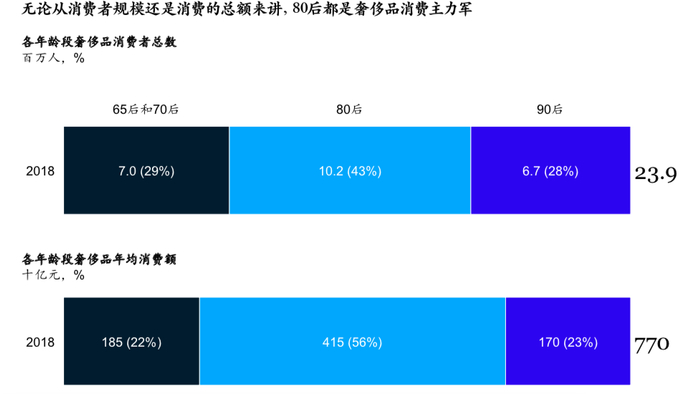 以“80后”和“90后”为代表的年轻一代,分别占到奢侈品买家总量的43%和28%,分别贡献了中国奢侈品总消费的56%和23%。