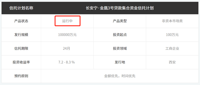 据悉,在2020年中爆出假黄金案之际,长安信托依然选择了进行兑付,成为继民生信托、东莞信托之后,第三家选择兑付的信托公司。有关于兑付的具体情况,长安信托对外表示与金凰珠宝合作的信托项目计划全部投资者已顺利兑付。但官网产品一栏却显示,此前因兑付延期的“长安宁·金凰3号”仍处于运行状态。