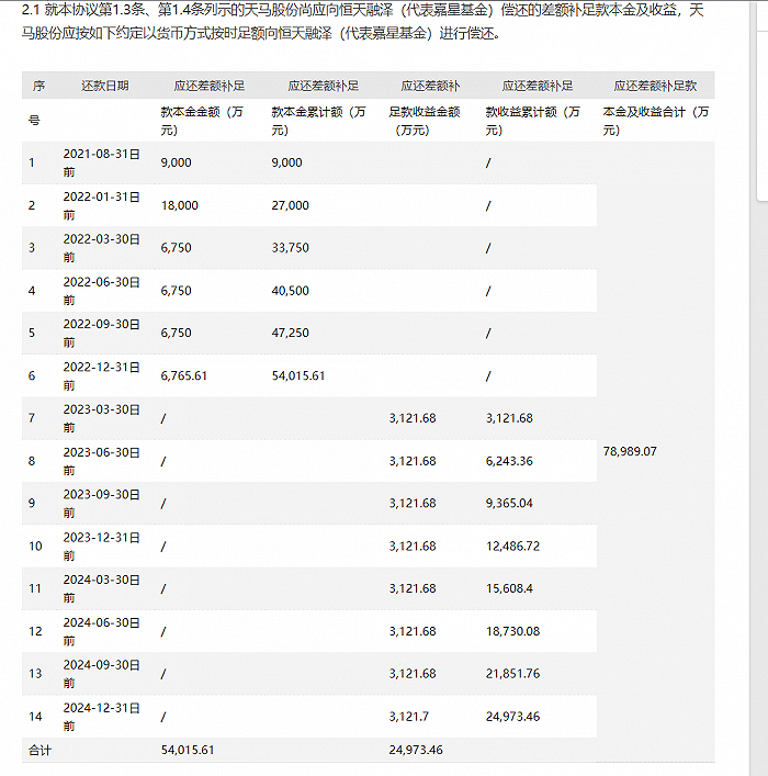 恒天财富此前与部分投资人签署兑付协议,承诺分别于今年8月底、2022年1月底以及明年年底偿还全部本金及剩余部分利息。界面新闻记者查阅天马股份公告发现,上述兑付日期与天马股份和恒天融泽签署的和解协议中约定的还款时间表基本对应。