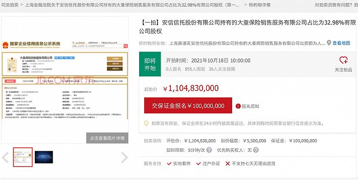 经界面新闻记者查询,上述拍卖标的已在京东网上挂出,涉及安信信托在大童保险中持有的全部股权(安信信托出资额4978.1344万元,股权占比32.9792%),对应起拍价为11.0483亿元,保证金1亿元,增价幅度550万元及其倍数。
