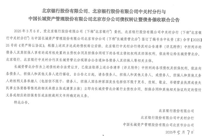 近日,北京银行(601139)、北京银行中关村分行与中国长城资产管理股份有限公司北京市分公司(下称“长城资管北分”)联合发布债权转让暨债务催收公告。