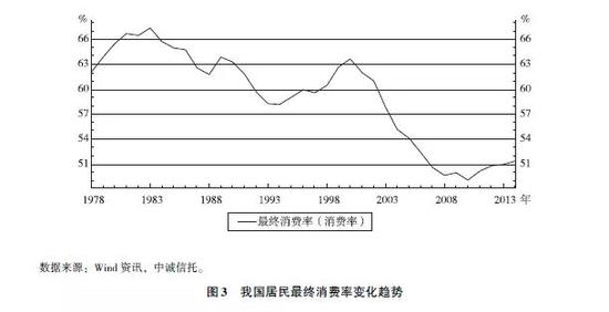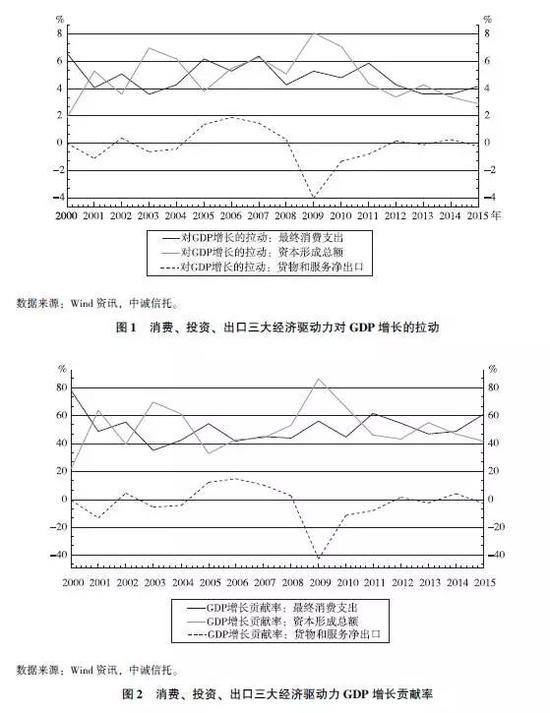 1978~2015年,作为拉动经济增长的三驾马车,消费、投资、出口对经济增长的驱动力和对经济增长的贡献率曲线呈现交织态势,尤其是消费和投资。近年来,消费逐渐恢复经济基石地位,成为对经济贡献度最大的需求因素。尤其是2008年国际金融危机后,在“四万亿”经济刺激计划下,消费需求仍然持平稳增长态势,对拉动经济增长的贡献度不断上升。