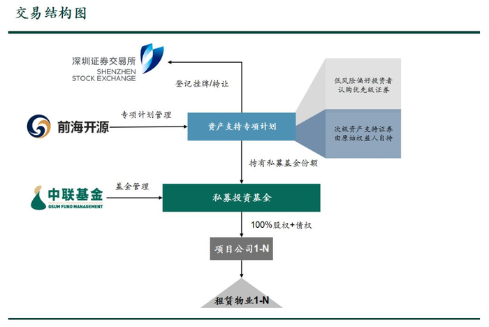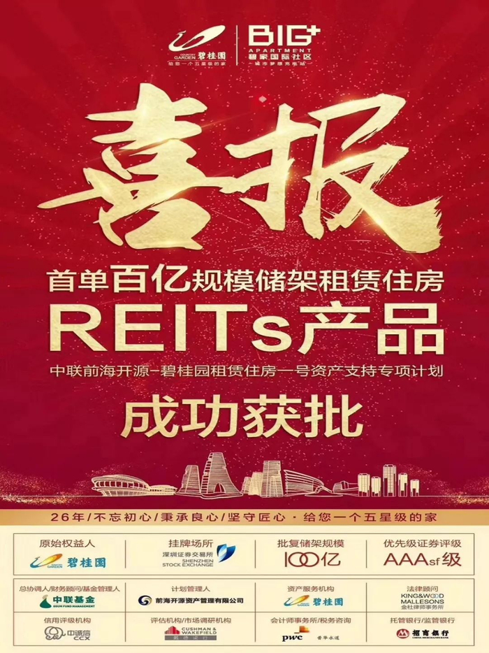 2月2日,首单百亿规模租赁住房REITs:“中联前海开源-碧桂园租赁住房一号资产支持专项计划”成功在深交所获批,由碧桂园控股有限公司联合中联前源不动产基金管理有限公司(以下简称“中联基金”)共同实施,产品规模100亿元,采取储架、分期发行机制,优先级评级AAAsf。