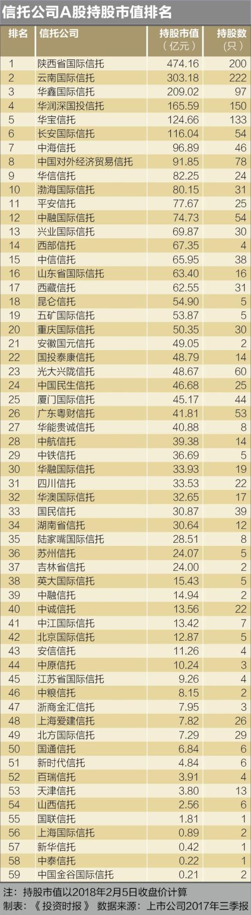 据Wind资讯提供的数据,标点财经研究院联袂《投资时报》对各家信托公司在A股市场上的持股情况和持股市值进行统计和研究。根据2017年三季度末十大流通股东中信托产品的持股数量,结合2018年2月5日收盘价计算出每只信托产品的持股市值,并加总得出各家信托公司在A股市场上的持股总市值。