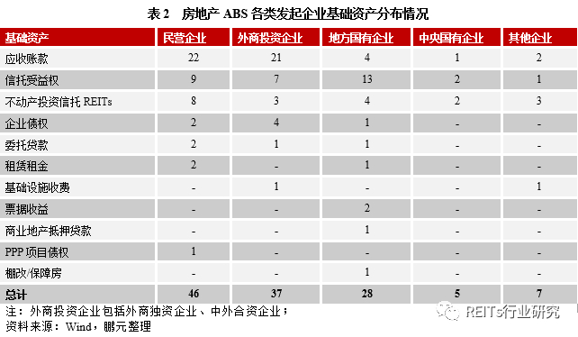 从基础资产类型来看,民营企业、外商投资企业发起的房地产ABS主要以应收账款为基础资产,而国有企业则是主要以信托受益权为基础资产。