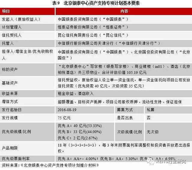 2016年8月19日,北京银泰中心资产支持专项计划正式成立为国内首单抵押型类REITs,交易结构采用信托模式结构,其基本要素如下表所示: