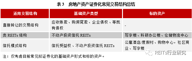 可作为证券化的标的资产有购物中心、写字楼、科研办公楼、仓储物流中心、数据中心、医疗康复中心、公寓酒店/度假村、社区商业、学校教育设施等。根据基础资产特征,房地产ABS的基础资产可以分为不动产信托投资基金(REITs)、既有债权和未来债权(收益权)。