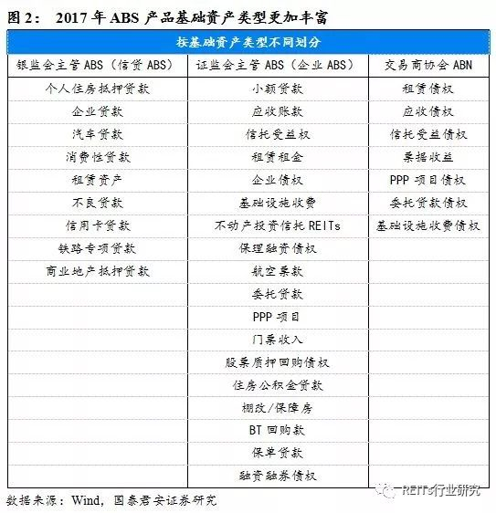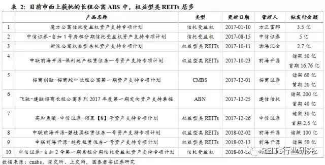 2017年是长租公寓ABS市场的元年:2017年2月,中国首单公寓行业资产证券化产品——“魔方公寓信托受益权资产支持专项计划”在上海证券交易所正式挂牌转让;随后10月,国内首单长租公寓权益型类REITs产品——“新派公寓权益型房托资产支持专项计划”正式“破冰”,自此打开了长租公寓的融资大门;12月,招商蛇口以发行人发行了全国首单全国首单储架式长租公寓CMBS和全国首单长租公寓ABN,这种银行与房企合作的长租公寓证券化模式,或成为未来住房租赁市场发展的主流。