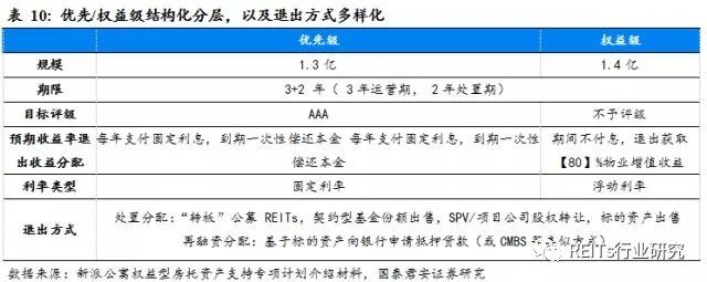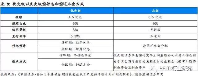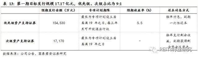 第一期目标发行规模17.17亿元,优先级、次级占比为9:1: 其中优先级资产支持证券规模为15.4亿元,预期收益率为固定5.5%,且证券评级AAA; 次级资产支持证券规模为1.7亿元。本专项计划针对优先级资产支持证券每3 年设有开放退出安排,可提前结束;次级资产支持证券不参与开放退出。