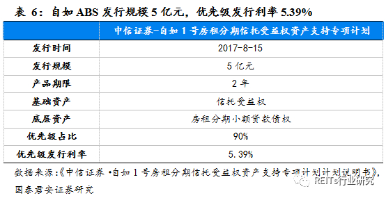 本次自如1号ABS发行规模为5亿元, 优先级和次级发行规模比例分别为90%和10%:1)优先级发行规模为4.5亿元,票面利率为5.39%,信用评级为AAA,预期到期日为2019年1月19日。