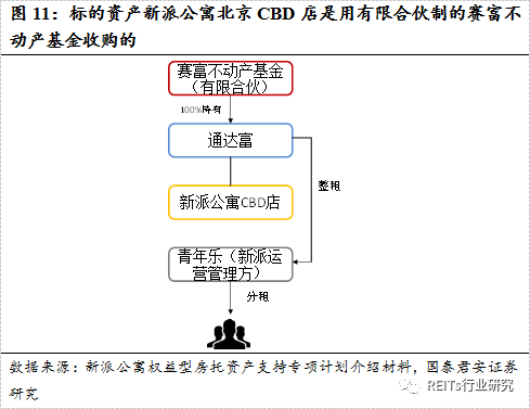 新派类REITS的基础资产是契约型私募基金份额,物业资产是新派公寓CBD公寓楼(含101间青年公寓)。新派公寓与其投资机构赛富投资基金联合发起的赛富不动产基金于2013收购了位于北京国贸核心区域的七十年住宅产权物业新派公寓CBD公寓楼,然后对其进行全面改造成品牌公寓长期持有并运营。其中赛富不动产基金(契约型私募基金)通过SPV持有通达富的全部股权和债权,青年乐从通达富整租新派CBD物业并对外分租。