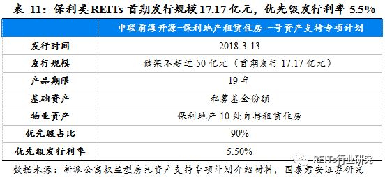 2017年10月23日,上交所出具《关于对中联前海开源-保利地产租赁住房一号资产支持证券挂牌转让无异议的函》;2018年3月13日,“中联前海开源-保利地产租赁住房一号资产支持专项计划”成功发行,这是国内首单央企租赁住房类REITs,也是首单储架发行类REITs。本次专项计划采取分期发行方式,此次储架总规模不超过50亿元,首期发行规模17.17亿元。