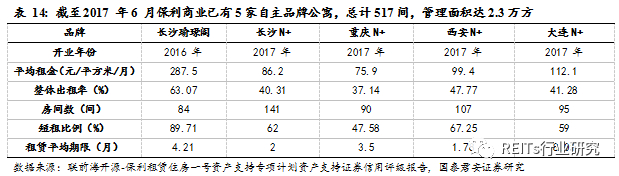 保利商业于2016 年11 月开始运营第一家自主品牌公寓,截至2017 年6 月末,保利商业共开业运营5 家自主品牌公寓,分别为长沙瑜璟阁、长沙N+、重庆N+、西安N+和大连N+,总计517间,管理面积达2.3万方,2017年1~6 月,保利商业自主品牌公寓实现业务收入599万元。