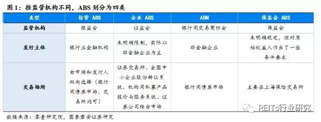 目前我国资产证券化产品由不同监管机构分别监管。按照监管机构的不同,我国资产支持证券可划分为银监会监管的信贷资产支持证券(简称“信贷ABS”),证监会监管的企业资产支持证券(简称“企业ABS”),央行旗下银行间市场交易商协会(简称“交易商协会”)监管的资产支持票据(Asset-Backed Notes,简称ABN),以及保监会监管的项目资产支持计划(简称“保监会ABS”)四种产品。