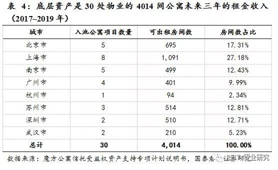 魔方公寓ABS的基础资产是中航信托设立的信托受益权,而信托受益权对应的底层资产是基于魔方中国及其魔方北京、魔方上海、魔方广州3个子公司在北京、上海、广州等一二线城市经营的30处物业的4014间公寓未来三年的租金收入。