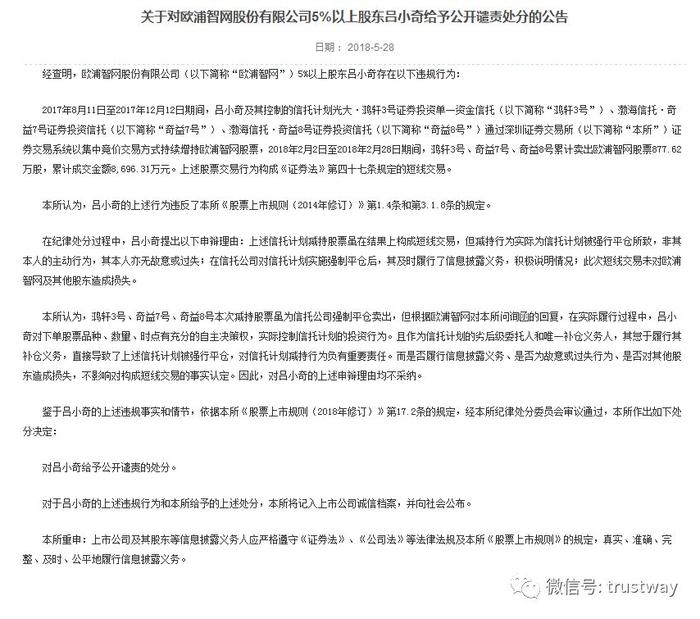 交易所认为,“鸿轩3号、奇益7号、奇益8号本次减持股票虽为信托公司强制平仓卖出,但根据欧浦智网对本所问询函的回复,在实际履行过程中,吕小奇对下单股票品种、数量、时点有充分的自主决策权,实际控制信托计划的投资行为。且作为信托计划的劣后级委托人和唯一补仓义务人,其怠于履行其补仓义务,直接导致了上述信托计划被强行平仓,对信托计划减持行为负有重要责任。“