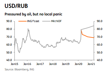 •假设油价回升,且当地没有资本外流,我们预计美元兑卢布将回到70-75区间,然而,卢布对油价和全球整体情绪的敏感性仍将保持高位。