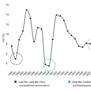 中国过去40年的实际GDP增长 (资料来源:中金公司,2019年12月。2019年和2020预期的数据由FSSA Investment Managers于2020年3月更新)