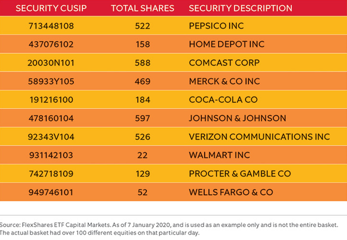 除了非透明ETF的发行人外,每天ETF发行人都必须公布目前持有的ETF,以及一个关于申购和赎回的清单(creation and redemption basket file)。清单会告知不同的市场参与者(他们其中一些是“流动性提供者”)哪些证券需要交付以进行申购,哪些证券需要收回以进行赎回。下面的列表显示在2020年1月7日,FlexShares Quality Dividend Index Fund(QDF) 中一些需要交付以进行申购的证券名称。