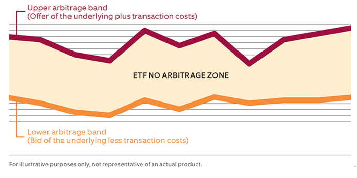 由于这种动态,ETF通常在所谓的“套利区间”(arbitrage bands)或“无套利区”(no-arbitrage zone)内交易。如下图所示,这一范围通常介于基础证券的加权平均买价(套利区间下限)和标的证券的加权平均卖出价(套利区间上限)之间,加上或减去其他交易成本(如申购/赎回费、印花税等)。