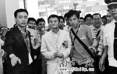 9点30分左右,一身白装的马云和广东省副省长佟星一行出现在会场门口,会场立即沸腾,人群开始向红地毯两侧“压缩”,工作人员挡着粉丝“护道”。网商们像追星的FANS一样,有节奏地喊着“马云、马云”,掌声随之响起。马云也微笑着挥手致意,闪光灯不断。