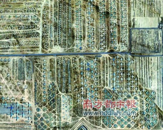 “谷歌地球”首次曝光世界最大“飞机墓”的高分辨率卫星图片,向世人清晰地展现这一壮观图景。B-52型轰炸机、F-14型战斗机、A -10型攻击机这些曾经的空中霸主如今像秦始皇兵马俑一般陈列在美国西南部亚利桑那州沙漠的“墓地”中。