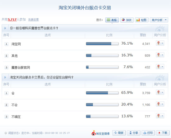 对于玩家的态度,昨天,新浪科技做了“淘宝关闭境外、台服点卡交易”的主题调查,数据显示,有63.8%的玩家表示即使关闭点卡售卖,也不愿意离开《魔兽》台湾服务器,只有20.6%的玩家表示会离开,另外有15.9%的网友表示不确定。