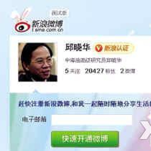 截至昨晚7时30分,邱晓华的微博开通不到两天,其微博粉丝数为20010,发表微博2篇,关注5人,分别是新浪美股、新浪头条新闻、新浪财经的官方微博,和著名经济学家韩志国、新浪财经总监邓庆旭的微博。