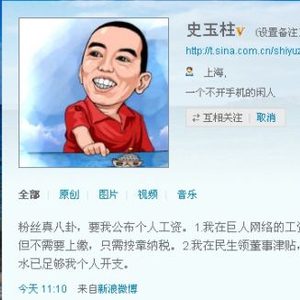 实际上,史玉柱在更早前已经在微博中透露自己的收入。去年12月,他曾在微博中透露,“我的工资和董事津贴的年税后收入不足百万,当然已足够我消费。”