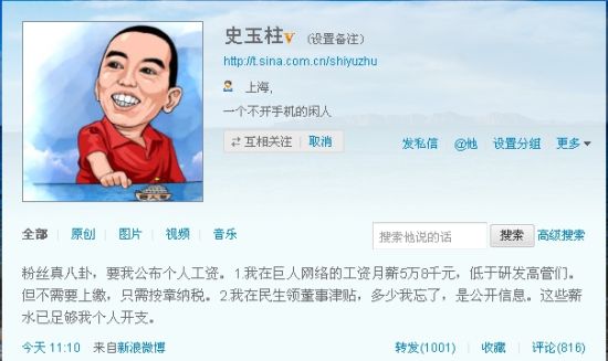 史玉柱微博透露个人工资:月薪不及巨人高管