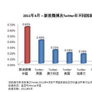 Hitwise数据显示,今年4月,新浪微博的访问量占到了中国互联网总访问量(Internet Visit)的0.63%,相当于每158次访问量就有一次是访问新浪微博。这一访问量占比超过了Twitter在英国、美国、法国、加拿大、澳大利亚和印度的数据。