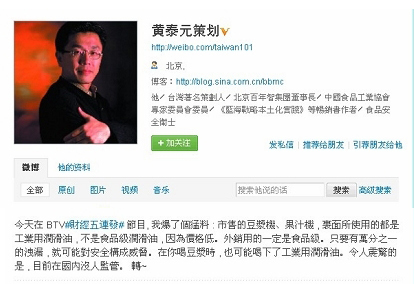 黄泰元在新浪微博上的身份认证显示,他曾参与过一些食品行业企业的营销策划,头衔除某集团董事长之外,还有策划人、“中国食品工业协会专家委员会委员”、食品安全卫士等。