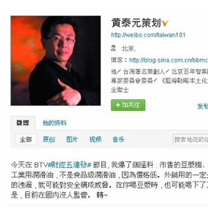 记者在新浪微博认证用户“黄泰元策划”的微博上看到:“今天在BTV‘财经五连发’节目,我爆了个猛料:市售的豆浆机、果汁机里面所使用的都是工业润滑油,不是食品级润滑油,因为价格低。外销用的一定是食品级。只要有万分之一的泄漏,就可能对安全构成威胁。令人震惊的是,目前国内没人监管。”