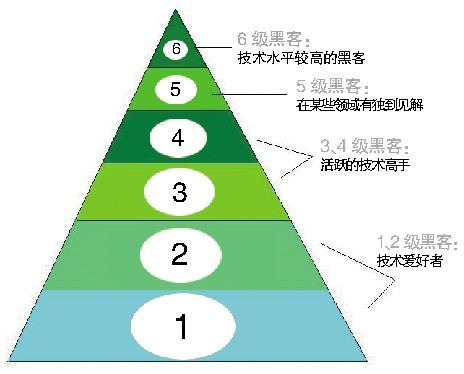 吴海波告诉记者,如果按照技术等级划分,国际上对这个圈子里的人的定级基本可分为六个等级。六级是技术水平相对较高者,他们一般具有高端rootkit编写、漏洞挖掘、深度逆向等技术能力,编程能力也很强;五级则是具备较强编程和技术开发能力的人,他们可能在技术上不如六级人员全面,但在某些技术领域有自己的独到见解;三级和四级黑客一般是信息安全产业的从业者或是活跃的技术高手;一级和二级黑客则主要由一些技术爱好者和初级信息安全行业从业人员组成。