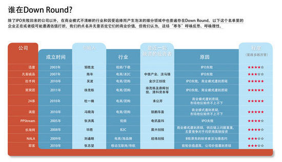 低迷情绪像被推倒的多米诺骨牌一样传导着。Down Round(“估值打折”,指投资者在一轮融资中购买同一家公司股票的价格低于对上一次融资投资者支付价格的情况)的阴霾如鬼魅般笼罩在中国互联网业以及一些传统行业之上。