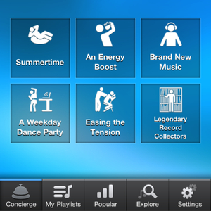 打开Songza,可以看到应用下部的5个按钮:“Concierge”、“我的歌单”、“流行”、“探索”和“选项”。其中“Concierge”(这是一个法语单词,意思是宾馆的迎宾部,软件开发者起这么个名字,大约是为了表明用户体验“宾至如归”?)是这款应用最具特色的功能。打开这一界面后,Songza会首先识别系统时间,如”星期一下午“,然后列出6个自动生成的歌单,比如下图中的“夏日”、“提神”、“新歌”、“舞会”、“按摩”和“传世名曲”。点击任一歌单,即可欣赏与当前情境相匹配的音乐。