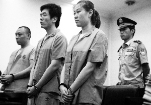 图为李晓航(左三)与男友等3人受审。