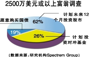 研究机构Spectrem Group对资产超过2500万美元或以上富翁调查发现,62%的受访者计划未来12个月投资股市,19%的受访者愿意购买国债,26%的受访者计划投资对冲基金。有市场人士表示,这或将为全球股市提供强劲的潜在支撑。