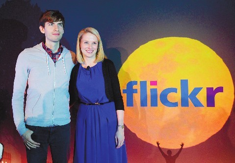 美国雅虎公司日前宣布将支付11亿美元收购博客网站坦布尔公司,以升级其图片分享网站flickr。坦布尔公司是家利润微薄的博客网站,用户超过1亿。图为在美国纽约,雅虎公司首席执行官玛丽萨·迈耶(右)与坦布尔公司创始人戴维·卡普参加记者会。