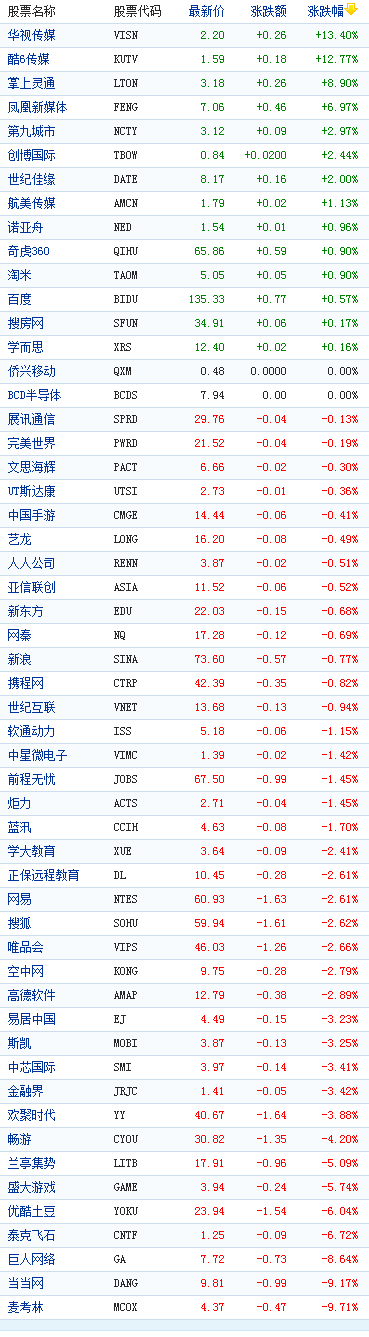 中国概念股周三收盘多数下跌,5支股票跌幅超过6%,麦考林跌9.71%,当当网跌9.17%,巨人网络跌8.64%,泰克飞石跌6.72%,优酷土豆跌6.04%;4支股票涨幅超过6%,华视传媒涨13.4%,酷6传媒涨12.77%,掌上灵通涨8.9%,凤凰新媒体涨6.97%。(峰子)