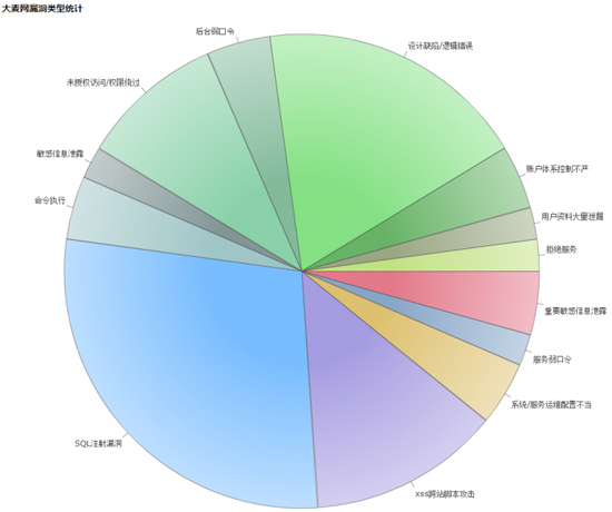 根据乌云平台数据统计,大麦网安全问题中漏洞类型占比最多的是“SQL注射漏洞”,其次是“设计缺陷/逻辑错误”,占比17%。除此之外,包括“XSS跨站脚本攻击”和“未授权访问/权限绕过”和“用户敏感信息泄露”也是几大常见漏洞问题之一。