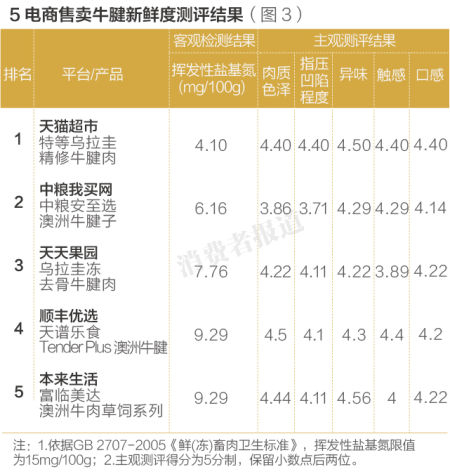 牛腱方面,受测的5款产品挥发性盐基氮指标也均低于国家标准《鲜(冻)畜肉卫生标准畜肉标准》规定的15mg/100g。其中,天猫超市特等乌拉圭牛腱表现更好,挥发性盐基氮仅含有4.1 mg/100g;中粮我买网的中粮安之选澳洲牛腱表现次之,顺丰优选和本来生活的牛腱产品则表现较差。北京志愿者费女士告诉记者,“天猫超市的牛腱让我一个从来不敢挑战牛肉的人炖出了成功的菜品处女作”。